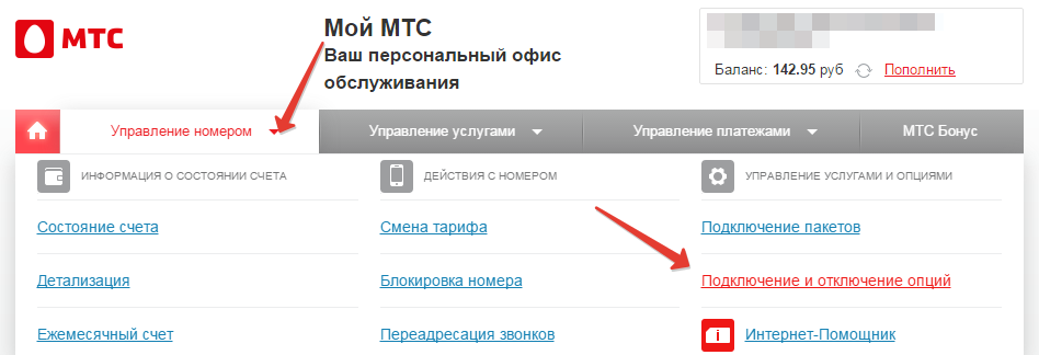 - Раскройте меню «Управление номером» и выберите пункт «Подключение и отключение».